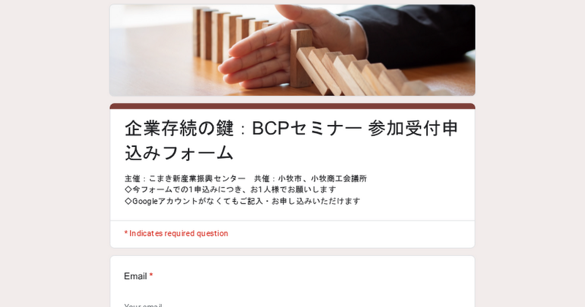 主催:こまき新産業振興センター 共催:小牧市、小牧商工会議所◇今フォームでの1申込みにつき、お1人様でお願いします◇Googleアカウントがなくてもご記入・お申し込みいただけます